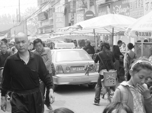 記者在育新街與六一路交叉口看到,路口的許多商販都把商品直接擺放在行車道上,有人站在街上與小販討價(jià)還價(jià),自行車、電動(dòng)車就橫七豎八地停在馬路上。站在路口往南看,高懸的禁行標(biāo)志下,剛好停了一輛綠色的出租車,本來(lái)就不寬的馬路被占去一半。