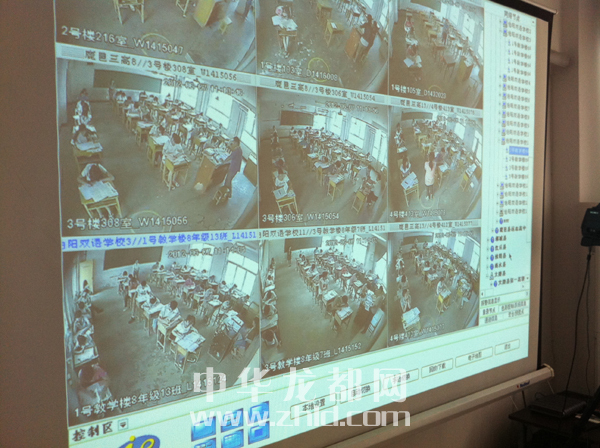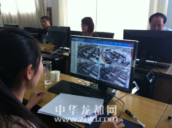 今年高考,我市全部使用視頻標(biāo)準(zhǔn)化考場。在二高視頻監(jiān)考室,9名監(jiān)考員正盯著監(jiān)控屏幕上34個考場的考試情況。記者看到,通過監(jiān)控屏幕,考場內(nèi)考生、監(jiān)考員的一舉一動都能映入眼簾。一名來自西華的監(jiān)考員告訴記者,之前他并不知曉自己會被分配到哪個考場、哪個崗位監(jiān)考,考試當(dāng)天上午在考點抽簽后,才根據(jù)簽位進入視頻室監(jiān)考。