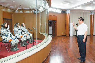 6月11日,中共中央總書記、國家主席、中央軍委主席習(xí)近平在酒泉衛(wèi)星發(fā)射中心觀看神舟十號載人飛船發(fā)射。這是習(xí)近平向即將出征的航天員聶海勝、張曉光、王亞平揮手致意。