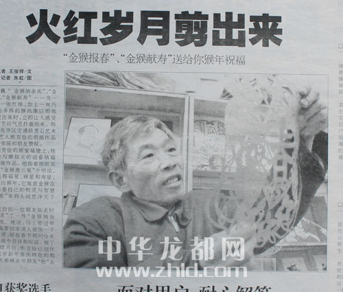 ????2003年底,周口晚報記者王俊祥在參加一個朋友的飯店開業(yè)時,偶然發(fā)現(xiàn)眾多禮品中有一幅貼在玻璃上的手工剪紙作品很是吸引眼球。通過打聽,得知這是熊克儉的作品。于是,王俊祥和攝影記者朱虹一起來到熊克儉家,在喜迎猴年之際,采寫了圖文并茂的消息《火紅歲月剪出來》。