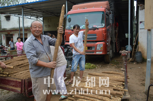 ??? 帶領(lǐng)家人到槐山藥行銷售自家槐山藥的老大爺,滿臉笑容地展示他收獲的長度近1米的槐山藥。