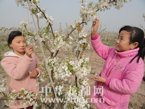 ???????4月12日,商水縣舒莊鄉(xiāng)北王張村的小學(xué)生在自家的梨園為梨花授粉。星期天,該村的小學(xué)生紛紛跑到梨園欣賞盛開的梨花,幫助家長為梨花授粉,享受著在梨花中勞動的樂趣。