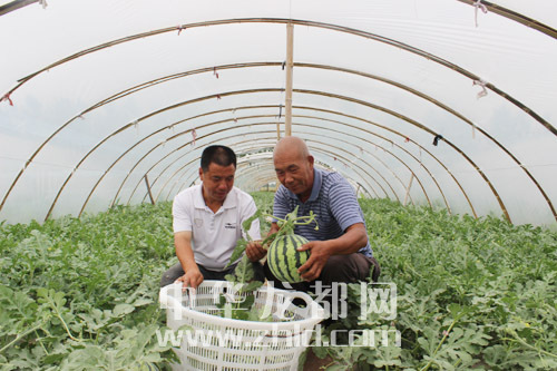 ??  近日,項(xiàng)城市南頓鎮(zhèn)大棚西瓜基地開園,培育的“半截樓”8428西瓜,因果瓤脆嫩、味甜多汁走俏市場。該基地?fù)碛写笈?0多個(gè),占地面積120多畝,畝均收入2萬多元。圖為該基地工作人員在采摘西瓜?! 。ǚ簿颁h 攝)