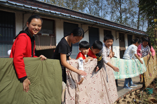 ????上圖:在九九重陽節(jié)來臨之際,為弘揚(yáng)中華民族傳統(tǒng)美德,營造尊老、敬老、愛老、助老的良好風(fēng)尚,項(xiàng)城市開展了“溫暖重陽·關(guān)愛老人”重陽節(jié)慰問活動(dòng),為敬老院的老人送去了慰問物品,讓老人們感受到社會(huì)的關(guān)愛和溫暖。圖為該市中小學(xué)生在南頓鎮(zhèn)敬老院為老人們晾曬被褥。 張永久 攝