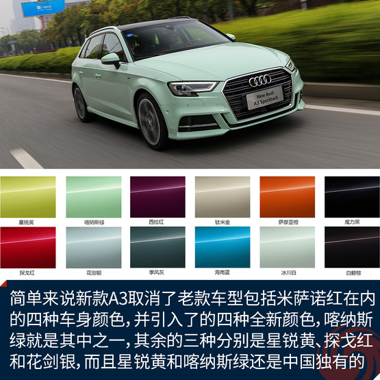 先來說說喀納斯綠到底是什么顏色吧。簡單來說新款A(yù)3取消了老款車型包括米薩諾紅在內(nèi)的四種車身顏色,并引入了的四種全新顏色,喀納斯綠就是其中之一,其余的三種分別是星銳黃、探戈紅和花劍銀,而且星銳黃和喀納斯綠還是兩種中國市場獨有的顏色。如果說這個顏色看上去像什么,我覺得大概像是哈密瓜冰激凌,或者是綠色的奶油,反正給我一種清新又甜蜜的錯覺。