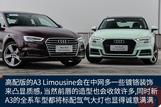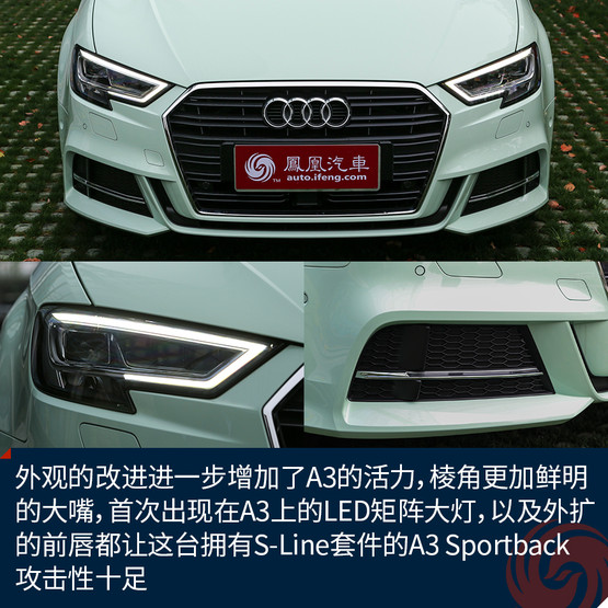 新顏色的加入讓原本青春靚麗的A3變得更加鮮嫩,雖說這樣的顏色不一定適合所有人,但是至少我是很喜歡的,應(yīng)該不少女生也會心生好感。而外觀的改進進一步增加了A3的活力,棱角更加鮮明的大嘴,首次出現(xiàn)在A3上的LED矩陣大燈,以及外擴的前唇都讓這臺擁有S-Line套件的A3 Sportback攻擊性十足,同時全系都將標(biāo)配氙氣大燈也是誠意滿滿。而高配置的A3 Limousine會在中網(wǎng)多一些鍍鉻裝飾來凸顯質(zhì)感,當(dāng)然前唇的造型也會收斂許多。