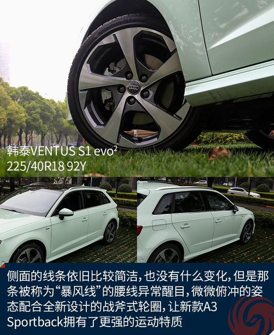 側(cè)面的線條依舊比較簡潔,也沒有什么變化,但是那條被稱為“暴風(fēng)線”的腰線異常醒目,微微俯沖的姿態(tài)配合全新設(shè)計的戰(zhàn)斧式輪圈,讓新款A(yù)3 Sportback擁有了更強的運動特質(zhì)。