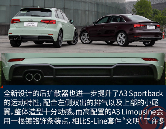 全新設(shè)計的后擴散器也進一步提升了A3 Sportback的運動特性,配合左側(cè)雙出的排氣以及上部的小尾翼,整體造型十分動感。而高配置的A3 Limousine會用一根鍍鉻飾條裝點,相比S-Line套件“文明”了許多。與LED矩陣大燈相呼應(yīng)的是全LED尾燈,兩者相輔相成為新車帶來了更強的攻擊性以及橫向視覺延展性,新加入的流動式轉(zhuǎn)向燈在美觀的同時也提升了整車的科技感。
