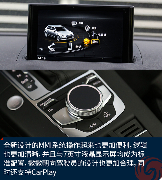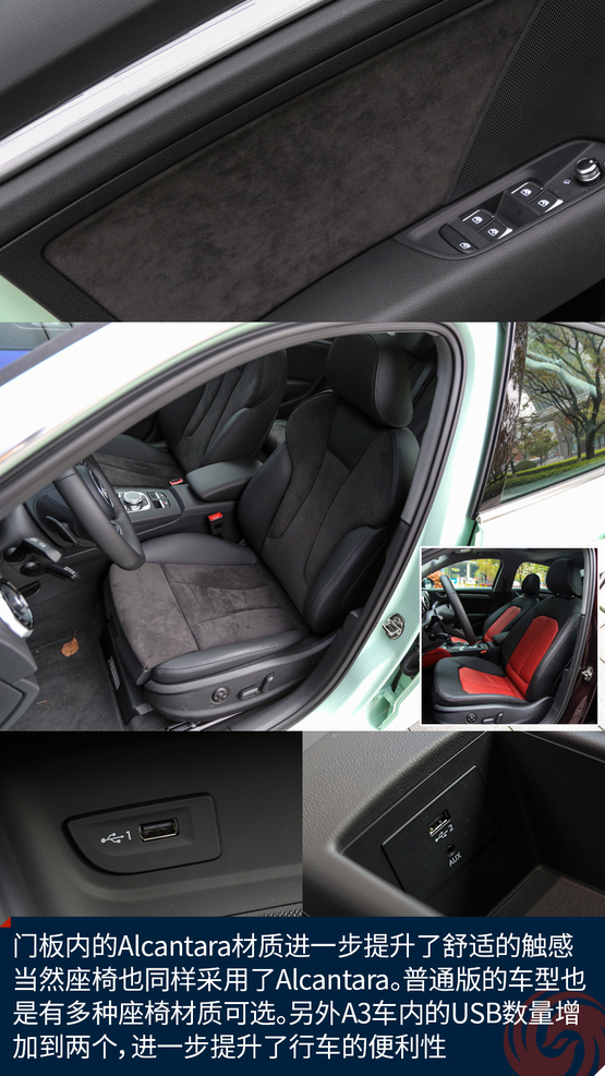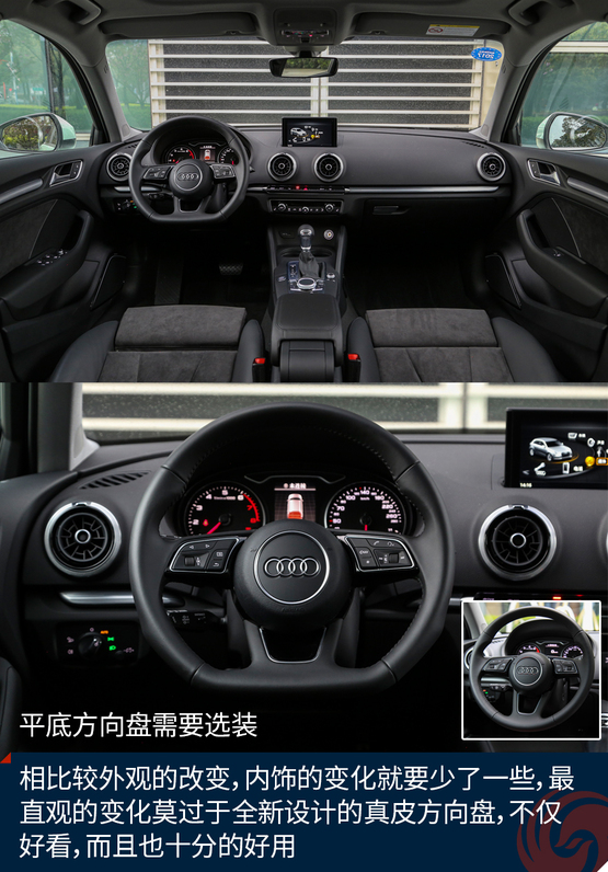 相比較外觀的改變,內(nèi)飾的變化就要少了一些,最直觀的變化莫過于全新設(shè)計的真皮方向盤,不僅好看也十分的好用,發(fā)光的迎賓踏板進一步增加了車輛的高級感,中控面板上的鋁合金材質(zhì)的裝飾條質(zhì)感出色,不僅如此,還有多種樣式和材質(zhì)可選;而門板內(nèi)的Alcantara材質(zhì)進一步提升了舒適的觸感,當(dāng)然座椅也同樣采用了Alcantara。另外新增加的USB接口也進一步增加了行車的便利性,這也讓A3車內(nèi)的USB數(shù)量增加到兩個。同時,全新設(shè)計的MMI系統(tǒng)操作起來也更加便利,邏輯也更加清晰,并且與7英寸液晶顯示屏均成為標(biāo)準(zhǔn)配置,微微朝向駕駛員的設(shè)計也更加合理,同時還支持CarPlay。