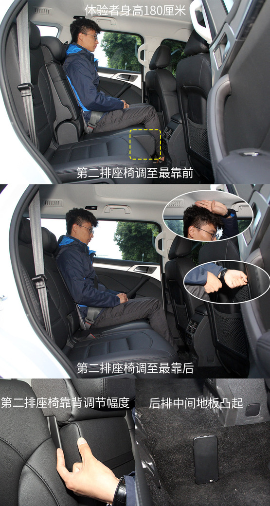 關(guān)于第二排,最重要的當然要數(shù)空間了。剛一坐到第二排之后,感覺確實是很寬敞,不僅腿部空間毫無壓力,頭部空間也完全沒有壓抑感,而且,第二排座椅還支持四向調(diào)節(jié),即座椅前后調(diào)節(jié)和靠背角度調(diào)節(jié),在第三排沒人乘坐的情況下,第二排乘客基本可以找到N種舒服姿勢來應對長途乘坐。只不過,第二排的中間地板凸起較高,一定程度上影響了中間乘客乘坐的舒適度。