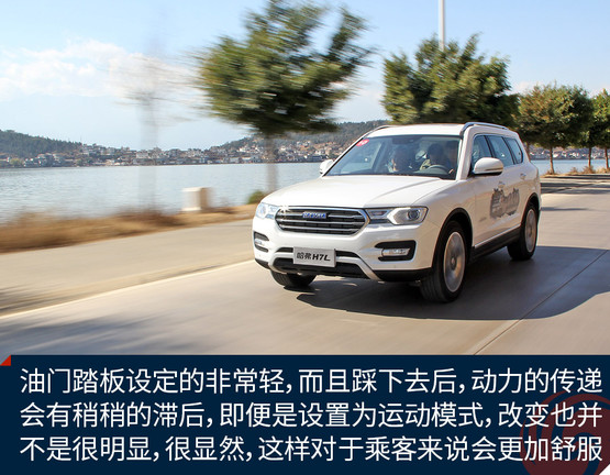 既然是7座車型,藍標H7L在調(diào)校方面也更加注重舒適,這一點從油門踏板可以很明顯的感覺到。油門踏板設(shè)定的非常輕,而且踩下去后,動力的傳遞會有稍稍的滯后,即便是設(shè)置為運動模式,改變也并不是很明顯,很顯然,這樣對于乘客來說會更加舒服。相比于油門踏板,剎車踏板則力度適中且比較線性。