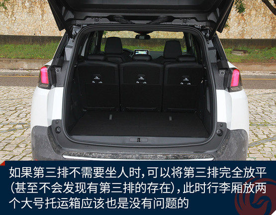 標致5008提供了三排座椅還有另外一個顯著的好處是,可以豐富行李廂的使用方式。通過實際體驗可以發(fā)現,當三排座椅全部立起時,標致5008的行李廂基本能夠放下兩個登機箱,但如果第三排不需要坐人時,可以將第三排完全放平(甚至不會發(fā)現有第三排的存在),此時行李廂放兩個大號托運箱應該也是沒有問題的。
