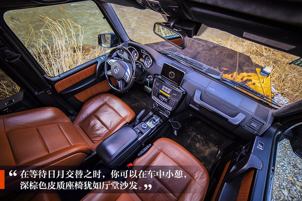 在等待日月交替之時,你可以在車中小憩,方殼子造型的車體,像是一個移動的居所,G 63 AMG中的深棕色皮質(zhì)座椅,就好似廳堂中的沙發(fā),供人高談、辨析、訴情、吹煙。中控九宮格數(shù)字“點唱機”,不再選擇聒噪的887,而是從中播出歲月的聲音,流出時間的經(jīng)典,隨著天色變暗,內(nèi)心也趨于平靜。