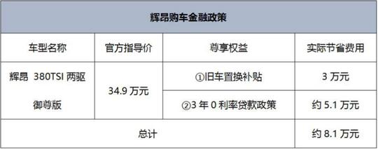 ????????目前購買輝昂,可享受首付30%,三年零利率的金融政策,同時還可以享受3萬元置換補(bǔ)貼或者1萬元保險(xiǎn)補(bǔ)貼,詳情請見下表: