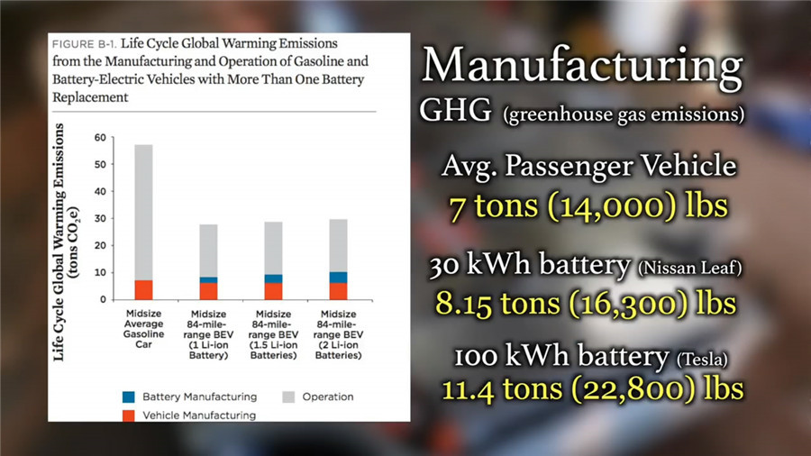????????無疑,電池比起傳統(tǒng)內燃機排放的溫室氣體要多的多。普通的內燃機乘用車在生產過程中會產生7噸的溫室氣體排放,而使用30千瓦時電池的日產聆風會排放8.15噸溫室氣體。至于100千瓦時電池的特斯拉Model S P100D更是會產生11.4噸的溫室氣體。