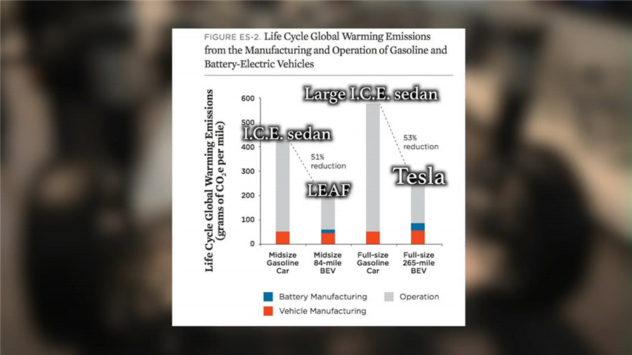 ????????但是如果算上在使用過程中產生的排放,在完整的使用周期中,電動車產生的總排放比內燃機汽車就少了一半左右。