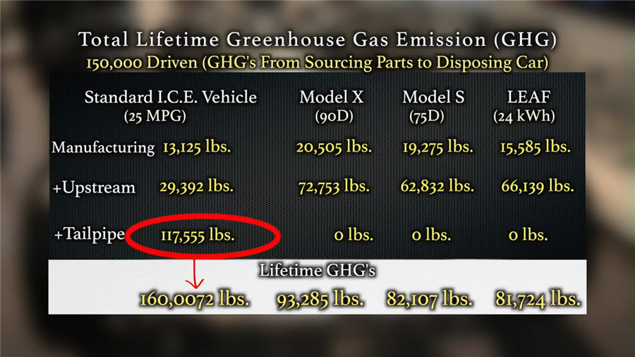 ????????這張表更加清晰,分別統(tǒng)計了普通內燃機汽車(25MPG=百公里油耗9.4升)、特斯拉Model X 90D、Model S 75D和聆風(電池容量24kWh)在車輛生產,燃油/電能生產過程以及駕駛使用過程中的排放,可以看到,盡管電動車在車輛生產、電能生產過程中產生的排放更高,但行駛工程中的零排放仍然使其在整個生命周期中的排放更低。
