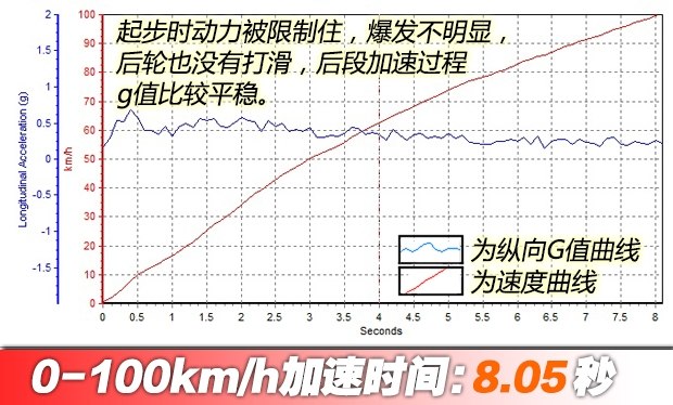 ????雖然可以關(guān)閉穩(wěn)定系統(tǒng),但感覺卻對發(fā)動機(jī)輸出非常保守,變速箱也不允許拉到很高的轉(zhuǎn)速。起步后車輪沒有明顯滑動,說明并沒有達(dá)到最佳輸出狀態(tài),最終成績?yōu)?.05秒,成績與老款車型有差距,略有遺憾。