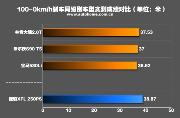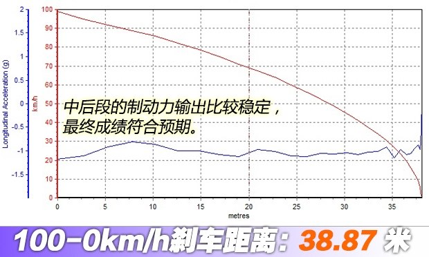 ????全力制動時車身有點頭的現(xiàn)象,但車身總體保持穩(wěn)定,最終成績?yōu)?8.87米,表現(xiàn)符合預(yù)期。這個成績在汽車之家的評價體系中,也屬于優(yōu)秀水平。