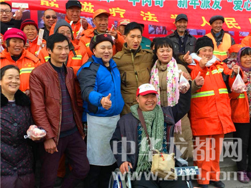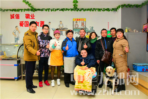 孫合理(左一)與領(lǐng)羊肉的殘疾朋友合影。
