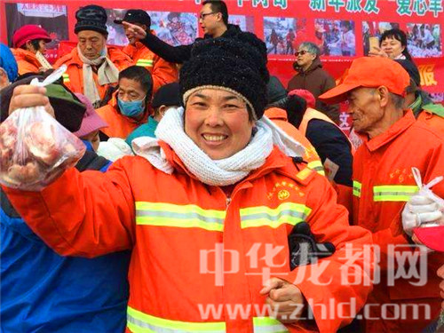 領(lǐng)到羊肉的環(huán)衛(wèi)阿姨很開(kāi)心地微笑著。