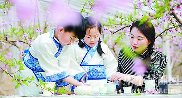 日前,一位年輕的媽媽帶著一雙兒女在扶溝縣韭園鎮(zhèn)的一個溫室大棚基地學(xué)習(xí)茶藝。據(jù)悉,該基地共有11個桃樹溫室大棚和200畝露地桃林。在近1個月的花期里,該基地免費(fèi)向游客開放。前來賞花的游客不但可以在花間彈古箏、拍照,也可以學(xué)習(xí)茶藝,既欣賞了美景,又陶冶了情操。谷志方 李永超 攝