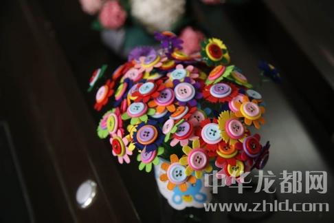 圖為3月12日,項城市特殊教育學校的孩子用扣子和針線做好的手工花卉,十分漂亮。