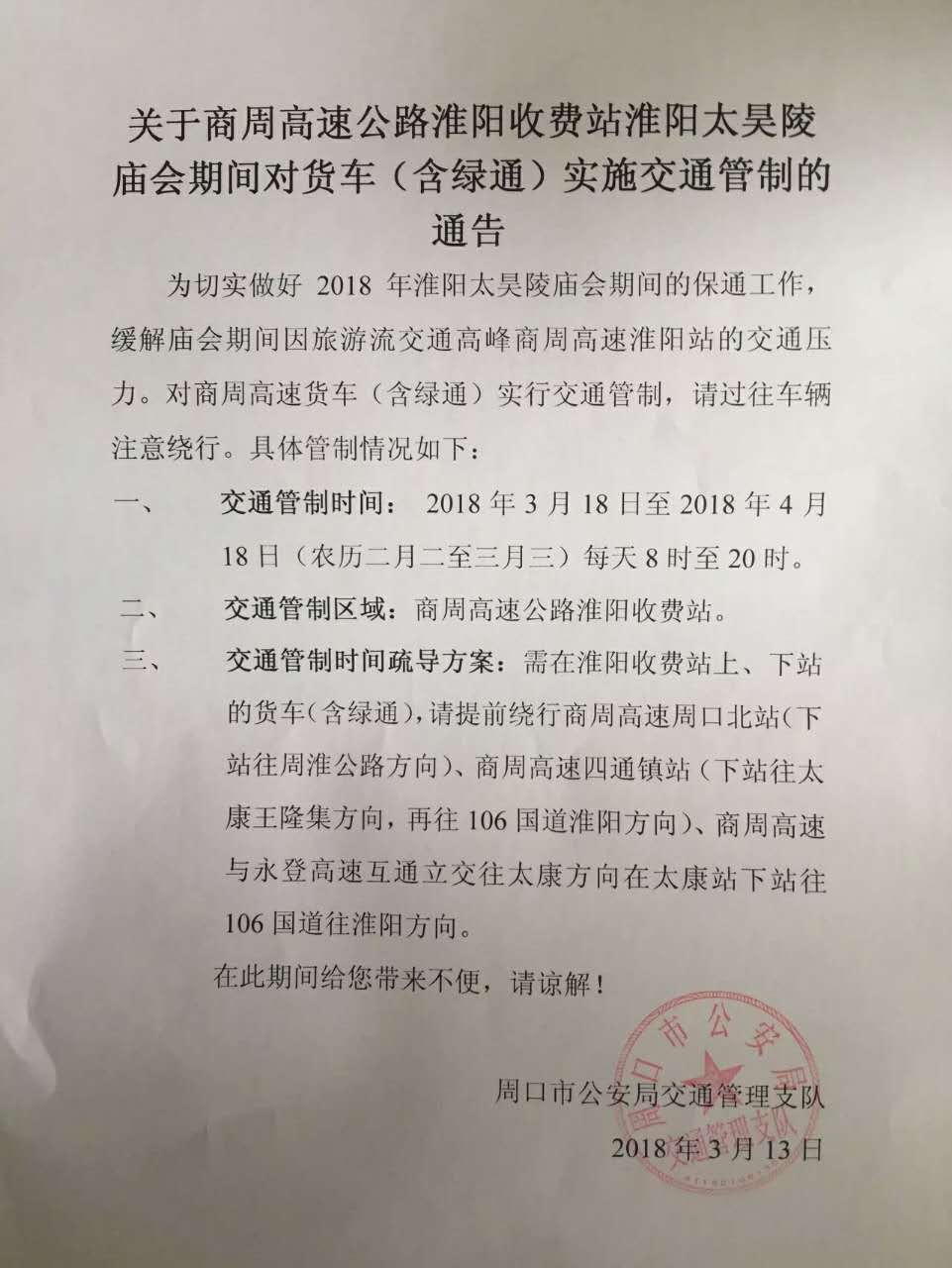 中華龍都網(wǎng)訊(周口報(bào)業(yè)全媒體記者 侯俊豫)3月13日,市交警支隊(duì)發(fā)布通告稱,為做好2018年太昊陵廟會(huì)期間的保通工作,緩解廟會(huì)期間商周高速淮陽站的交通壓力。對(duì)商周高速貨車(含綠通)實(shí)行交通管制,請(qǐng)過往車輛注意繞行。現(xiàn)對(duì)商周高速貨車(含綠通)實(shí)行交通管制: