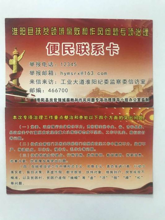 今年4月,淮陽縣扶貧領(lǐng)域腐敗和作風(fēng)問題專項(xiàng)治理全面啟動(dòng)。為確保專項(xiàng)治理取得實(shí)效,縣紀(jì)委監(jiān)委印制發(fā)放“便民聯(lián)系卡”,進(jìn)一步加大宣傳力度,暢通信訪舉報(bào)渠道。他們統(tǒng)一制作的扶貧領(lǐng)域腐敗和作風(fēng)問題專項(xiàng)治理便民聯(lián)系卡,上面印有專項(xiàng)治理工作重點(diǎn)整治和查處的4個(gè)方面內(nèi)容。具體包括黨委、政府履行主體責(zé)任不力,脫貧攻堅(jiān)工作不扎實(shí),敷衍應(yīng)付;扶貧部門及相關(guān)職能部門脫貧攻堅(jiān)工作中不作為、慢作為、亂作為等;扶貧領(lǐng)域發(fā)生貪污侵占,虛報(bào)冒領(lǐng),截留挪用等問題。聯(lián)系卡公布了舉報(bào)電話和來信來訪地址,方便群眾對黨員干部和部門的監(jiān)督。