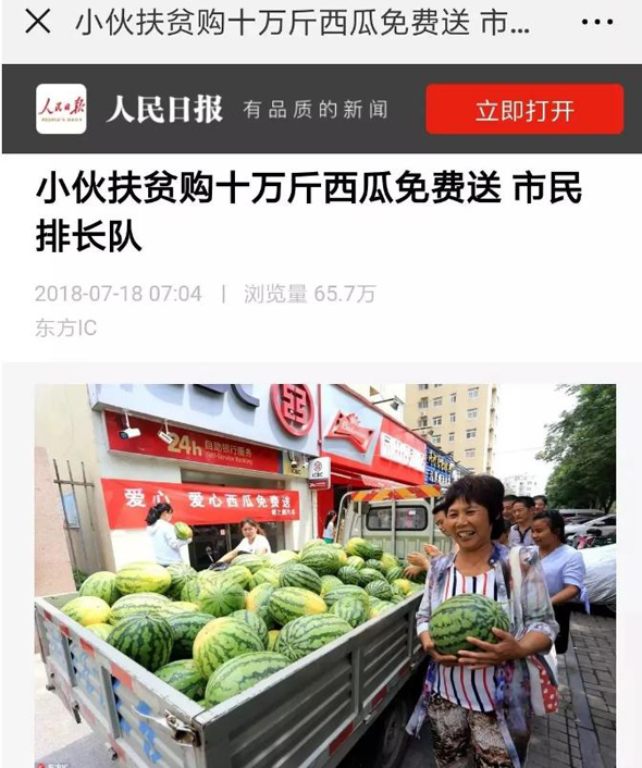 7月18日,《人民日?qǐng)?bào)》客戶端播發(fā)了“小伙購十萬斤西瓜免費(fèi)送 市民排長(zhǎng)隊(duì)”的一條新聞,瞬間刷屏朋友圈,一天閱讀量就突破100萬人次,加上騰訊新聞、人民圖片截至19日發(fā)稿時(shí)閱讀量已達(dá)一百五十萬人次,評(píng)論13000多條,人們都在稱贊咱扶溝小伙宋鐵托的善舉,被網(wǎng)友稱他為“愛心西瓜哥”。