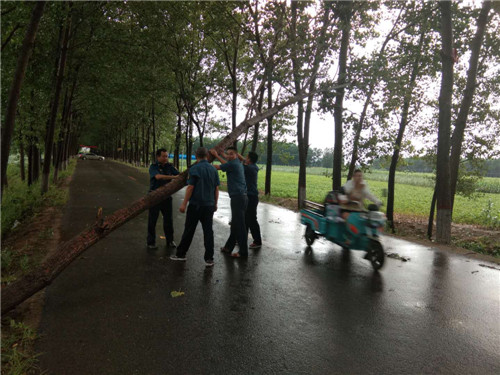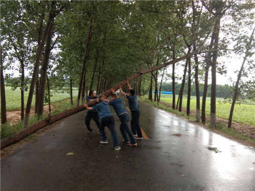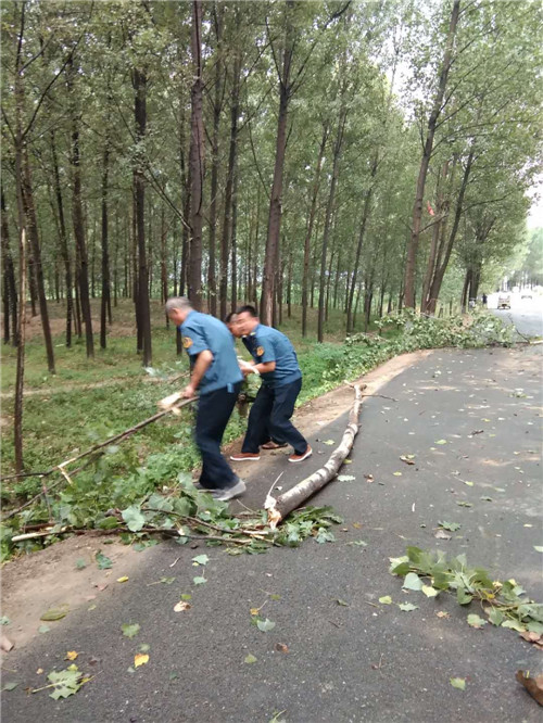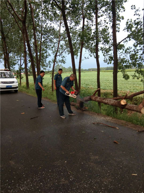 在東夏看張立交橋、李莊橋處,多棵行道樹被大風(fēng)刮倒,大量枝掉落在公路上,嚴(yán)重危及行車安全和道路通行,執(zhí)法人員立即冒雨采取安全防護(hù)措施,并利用車載應(yīng)急搶險工具將倒塌在公路上直徑為10-20cm的樹木進(jìn)行及時清理,并對殘枝落葉進(jìn)行了全面清掃。歷時三個小時,及時地消除了道路安全隱患,保障人民群眾的出行安全。