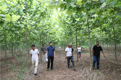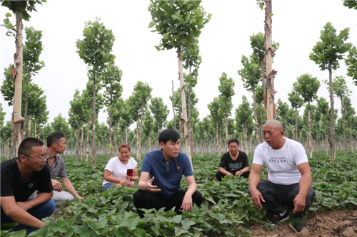 與前廟相鄰的大張村,是一個“天然大氧吧”。從大張村走出來的曹紅星在鄭州從事園林綠化多年,在朱口鎮(zhèn)黨委、鎮(zhèn)政府的支持和鼓勵下,他以1000元/畝的價格流轉(zhuǎn)了1000多畝土地,種植法桐、欒樹、國槐等綠化樹。有著豐富經(jīng)驗的曹紅星在種植綠化樹的同時,積極發(fā)展林下經(jīng)濟(jì),在綠化樹下種植紅薯、大蒜等,有效提高了土地的利用率,經(jīng)濟(jì)效益顯著提高。“平時,綠化林地除草、抗旱、施肥需要用工,收種紅薯、大蒜等也需要用工,用工時貧困戶優(yōu)先。只要有勞動能力,來這里就能掙錢?!辈芗t星說,林業(yè)經(jīng)濟(jì)的快速發(fā)展為鄉(xiāng)親們脫貧致富提供了保障。