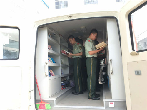 文化擁軍是商水縣圖書館的優(yōu)良傳統(tǒng)。當(dāng)天,流動(dòng)圖書車一來到縣武警中隊(duì)駐地,士兵們便不約而同圍了過來,有的走上圖書車尋找喜愛的圖書,有的則直接坐在車上,認(rèn)真翻閱書籍。戰(zhàn)士小劉表示:“我最喜歡人物傳記方面的圖書,今天他們送來了許多。我要充分利用這些圖書,讀好書、立好志、當(dāng)好兵,為實(shí)現(xiàn)中國夢(mèng)、強(qiáng)軍夢(mèng)和祖國的國防建設(shè)作出應(yīng)有貢獻(xiàn)。”
