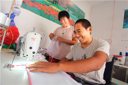 生意閑的時(shí)候,朱建舟又和妻子商量,借錢購買了兩臺(tái)縫紉機(jī),幫助附近一家工廠加工環(huán)保袋。加工活雖然不累,但對(duì)于雙腿殘疾的朱建舟來說卻很困難。一向愛動(dòng)腦筋的朱建舟自己動(dòng)手把縫紉機(jī)踏板改裝成手動(dòng)式的,大大提高了工作效率。“一個(gè)月能掙2000多元錢,還能顧家,照顧病人和孩子。”王五妮心里有說不出的高興。