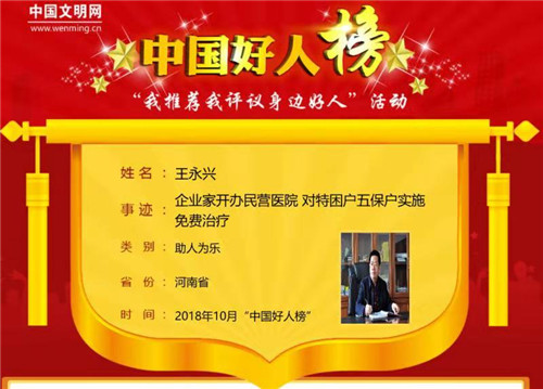太康縣農(nóng)家出身的王永興熱心公益,累計(jì)投資高達(dá)數(shù)千萬(wàn)元。10月31日上午,10月中國(guó)好人榜發(fā)布儀式暨全國(guó)道德模范與身邊好人現(xiàn)場(chǎng)交流活動(dòng)在江蘇連云港舉行,太康縣王永興榮登10月份助人為樂類“中國(guó)好人榜”。據(jù)悉,太康縣入選“中國(guó)好人榜”人數(shù)已達(dá)42人。