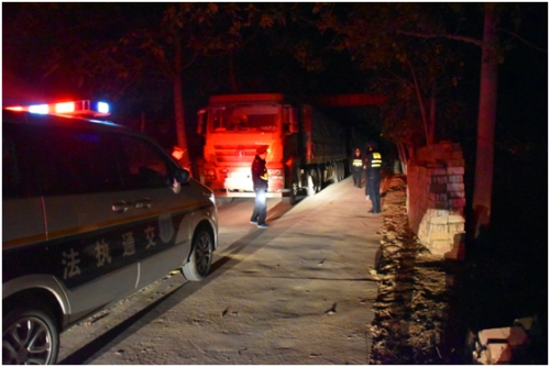當日22時40分,該所副所長楊春風(fēng)同志帶領(lǐng)兩個執(zhí)法中隊,對縣區(qū)域內(nèi)重點路段24小時不間斷巡查,在巡查到轉(zhuǎn)樓鄉(xiāng)通往龍曲鎮(zhèn)的X001線時,發(fā)現(xiàn)4輛大型超限車輛,其中3輛為“百噸王”,1輛為嚴重超載標掛。司機為抗拒檢查,鎖閉車門遠處觀望,我執(zhí)法人員堅守執(zhí)法現(xiàn)場,并及時調(diào)用拖車支援,另指派執(zhí)法人員與司機溝通,在動之以情、曉之以理的講解治超政策下,得到了司機的主動配合,把車輛暫扣至超限車輛卸載點。