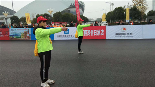 11月18日,在2018周口馬拉松暨善跑中國周口站現(xiàn)場,一個個身穿統(tǒng)一服裝的志愿者活躍在賽道之上,他們或給選手舉路線指示牌,或伸出大拇指給路過選手一個大大的“贊”,成為賽場內(nèi)外一道靚麗的風(fēng)景。