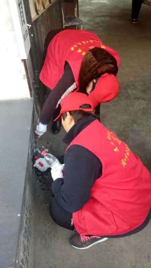 為了加快清理的速度,有的志愿者兩兩搭班,一個人用瓶裝水噴在小廣告處,另一個則趕忙用抹布進(jìn)行擦拭。別小瞧這些小廣告,清理起來很費時、費力,有時候一個小廣告需要花費五、六分鐘的時間才能清理干凈,讓人累的手臂酸麻。