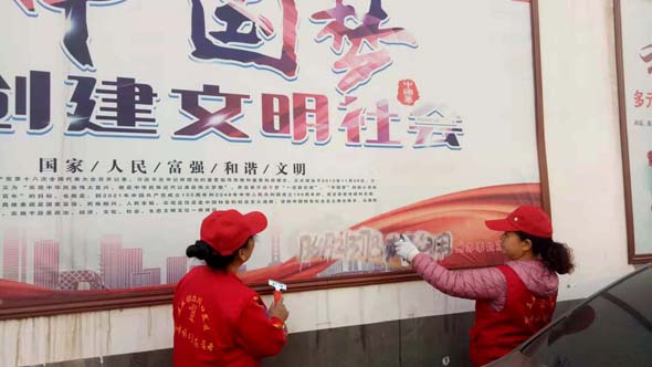 前來參加活動的劉愛青和岳巧玲兩位老人今年都是61歲,她們在清理小廣告的時候,動作麻利,做事認(rèn)真,直到把每一個小廣告清理的干干凈凈才才肯罷手。