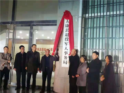 11月27日,太康縣退役軍人事務局掛牌成立??h委常委、常務副縣長張保華,縣委常委、副縣長韓維俊,縣政協(xié)副主席、縣民政局局長劉鳳芹出席揭牌儀式??h編辦主任毛雙龍、縣退役軍人事務局干部職工參加揭牌儀式。