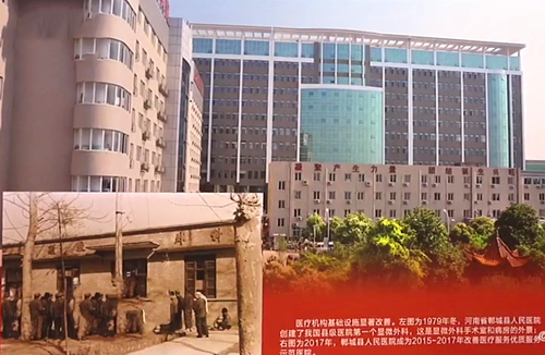 河南電視臺(tái)記者陳貞君在展覽板前介紹,這里是位于第四展區(qū)的兩幅同一所醫(yī)院的照片——河南省鄲城縣人民醫(yī)院,這張是1979年冬天,鄲城縣人民醫(yī)院創(chuàng)建了我國(guó)縣級(jí)醫(yī)院第一個(gè)顯微外科,這就是當(dāng)時(shí)的顯微外科的手術(shù)室和病房的外景,這張是2017年的鄲城縣人民醫(yī)院??梢哉f(shuō)改革開(kāi)放讓同一所醫(yī)院有了滄海桑田般的變遷。