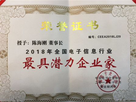 在當日下午召開的全國電子信息行業(yè)優(yōu)秀企業(yè)家表彰大會上,公司董事長陳海剛榮獲“2018年全國電子信息行業(yè)最具潛力企業(yè)家”榮譽稱號。