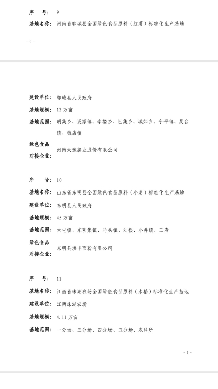 12月30日,中國(guó)綠色食品發(fā)展中心發(fā)布2018年全國(guó)綠色食品原料標(biāo)準(zhǔn)化生產(chǎn)基地名單,全國(guó)14個(gè)申報(bào)的基地獲批,鄲城縣人民政府在胡集鄉(xiāng)、汲冢鎮(zhèn)、李樓鄉(xiāng)、巴集鄉(xiāng)、城郊鄉(xiāng)、寧平鎮(zhèn)、吳臺(tái)鎮(zhèn)、錢店鎮(zhèn)等8個(gè)鄉(xiāng)鎮(zhèn)建設(shè),河南天豫薯業(yè)有限公司作為對(duì)接企業(yè)的12萬(wàn)畝紅薯種植基地榜上有名。