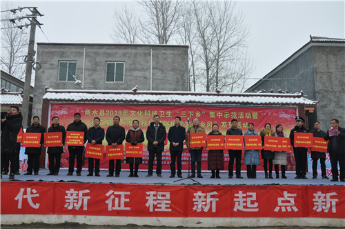 1月10日上午,雪花飛舞,天寒地凍。然而,商水縣袁老鄉(xiāng)王屯行政村文化大院暖 意融融,千人歡聚,同樂同慶,共享黨的溫暖。由縣委宣傳部、縣文明辦、縣文廣局 等部門聯(lián)合舉辦的商水縣2019年文化、科技、衛(wèi)生“三下鄉(xiāng)”啟動(dòng)儀式在這里舉行。