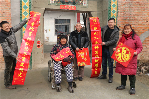 1月16日,西華縣艾崗鄉(xiāng)鐵爐村村民馬永清接過(guò)該縣縣委宣傳部駐村扶貧干部送來(lái)的春聯(lián)喜上眉梢。據(jù)了解,今年春節(jié)前夕,該縣財(cái)政投入200余萬(wàn)元購(gòu)置80萬(wàn)副春聯(lián)在全縣鄉(xiāng)村范圍內(nèi)廣泛開(kāi)展贈(zèng)春聯(lián)、送祝福活動(dòng)。