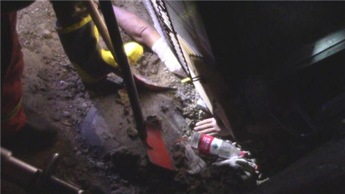 指揮員在與司機溝通時發(fā)現(xiàn),由于車身很重,司機手臂很快出現(xiàn)血液流通不暢、知覺微弱現(xiàn)象,如不及時脫困,后果十分嚴重。情況緊急,救援人員先利用剪擴器對駕駛室與被困人員手臂處進行擴張,但由于車身較重,地面所墊硬物無法承受壓力,擴張器無法發(fā)揮作用。隨后,救援人員利用鐵鍬在被困人員手臂下進行挖土,5分鐘后,隨著空間的逐漸擴大,被困人員手臂被小心翼翼抽回,司機成功脫困,消防指戰(zhàn)員從駕駛證另一側(cè)把他救出。