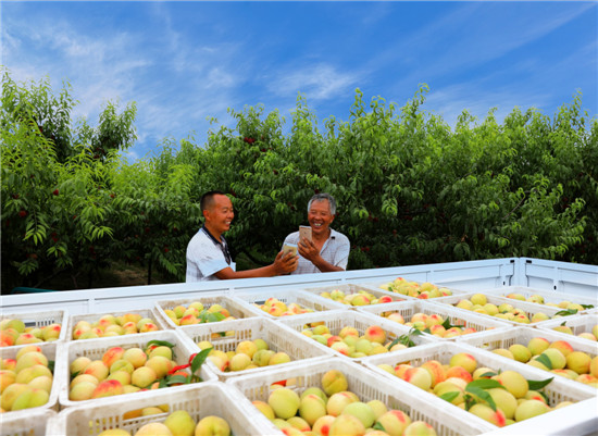 6月19日,在萬畝桃園里,桃農(nóng)臉上洋溢著收獲的喜悅,看見記者拍照,熱情地從籃里桃了一個(gè)又大又紅的鮮桃遞給記者品嘗(圖一)。一名慕名而來的游客購買了十幾斤鮮桃后掏出手機(jī)掃描桃農(nóng)的手機(jī)微信收款碼支付(圖二)。