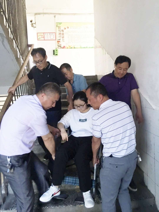 原來(lái),6月22日夜晚,實(shí)驗(yàn)中學(xué)考生晉淼突患急性闌尾炎,住院動(dòng)了手術(shù)后,身體十分虛弱,只得通過(guò)輪椅“行走”。家長(zhǎng)看著心疼,就勸她安心養(yǎng)病,明年再考,但晉淼堅(jiān)持參加考試。25日中考開(kāi)考首日,晉淼在家人陪護(hù)下,坐著輪椅來(lái)到實(shí)驗(yàn)中學(xué)考點(diǎn)。由于規(guī)定考生家長(zhǎng)不得進(jìn)入考場(chǎng),實(shí)驗(yàn)中學(xué)考點(diǎn)負(fù)責(zé)人商議后決定,由學(xué)??紕?wù)人員承擔(dān)把她抬進(jìn)考場(chǎng)的“任務(wù)”?!昂⒆咏唤o我們,您就放心吧?!蓖惶нM(jìn)考場(chǎng)的女兒,晉淼的家人欣慰地笑了。