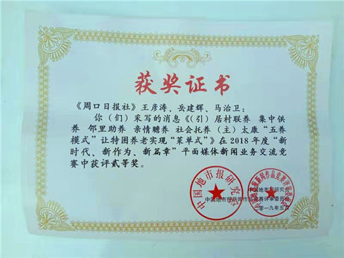 中國地市報新聞獎評選活動由中國地市報研究會主辦,每年舉辦一次,在全國有著廣泛的影響,此項新聞獎評選活動涉及全國幾乎所有地市黨報,不僅是展示地市黨報形象的重要舞臺,也是衡量地市黨報辦報水平的重要標(biāo)志,同時也是以新聞的形式展示各地亮點工作的重要?!短怠拔屦B(yǎng)模式”讓特困養(yǎng)老實現(xiàn)“菜單式”》稿件在此項新聞獎評選中,同樣表現(xiàn)不凡,最終榮獲中國地市報新聞獎二等獎。