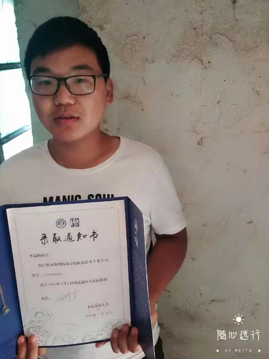 據(jù)了解,李高輝是一個(gè)命苦的孩子,很小的時(shí)候父親因病去世,母親改嫁,無(wú)奈,他只好跟隨年邁多病的爺爺奶奶一起生活,家庭十分拮據(jù)。俗話說(shuō),窮人的孩子早當(dāng)家。李高輝從小學(xué)就知道勤奮學(xué)習(xí),養(yǎng)成了不懼困難,愛幫助別人的性格,深受師生喜愛。經(jīng)過(guò)10多年努力拼搏,2019年高考,他以優(yōu)異的成績(jī)被大連海事大學(xué)航空學(xué)院錄取。